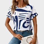 Les stocks sont très limités et partent rapidement. Si le bouton « Ajouter au panier » est encore visible, le produit est toujours disponible..Un t-shirt élégant orné d'un motif abstrait moderne dans des tons de bleu et de blanc. La pièce idéale pour des tenues du quotidien qui se démarquent.