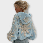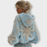 Brillez de mille feux pendant les fêtes avec ce magnifique sweat à capuche orné à la main de perles scintillantes et de cristaux évoquant la neige fraîchement tombée. Confortable et glamour à la fois, c'est la pièce idéale pour célébrer Noël, les escapades hivernales et les nuits magiques sous la neige.
