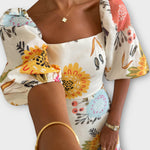 Son corsage structuré et sa jupe étagée offrent un mouvement gracieux, tandis que son encolure carrée et ses manches bouffantes apportent une élégance intemporelle.