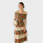 Cette robe est conçue pour flatter et ravir – avec un décolleté Bardot romantique et un mélange ludique de motifs floraux.