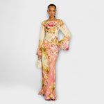Plongez dans un univers romantique avec notre robe longue idéale pour les garden-parties, conçue pour sublimer la féminité. Cette robe somptueuse présente un mélange harmonieux d'imprimés vibrants qui s'animent à chaque mouvement.