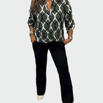 Les stocks sont très limités et partent rapidement. Si le bouton « Ajouter au panier » est encore visible, le produit est toujours disponible..Women's **casual shirt with a modern geometric print** in khaki and white tones. Its relaxed design, combined with the rolled-up sleeves, offers comfort and elegance, making it ideal for both casual and more formal occasions.