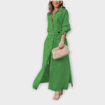 Amelina maksikleit ühendab struktuuri ja voogavust, luues kleidi, mis mõjub ühtaegu kerge ja viimistletuna. Klassikaline krae, nööpidega esiosa ja vöökohalt rõhutatud siluett teevad sellest täiusliku valiku nii päevaseks kandmiseks kui ka õhtusteks hetkedeks.