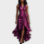 Les stocks sont très limités et partent rapidement. Si le bouton « Ajouter au panier » est encore visible, le produit est toujours disponible..Celestina satiinkleit on loodud mõjusa elegantsi ja graatsilise liikumise jaoks. Voolav satiin, rüüsitud vööpael ja kõrge ees-pikem/tagant-pikem alläär loovad silueti, mis püüab pilke igal sammul. Ideaalne valik galaõhtuteks, pulmadeks või sündmusteks, mis nõuavad erilise sära.